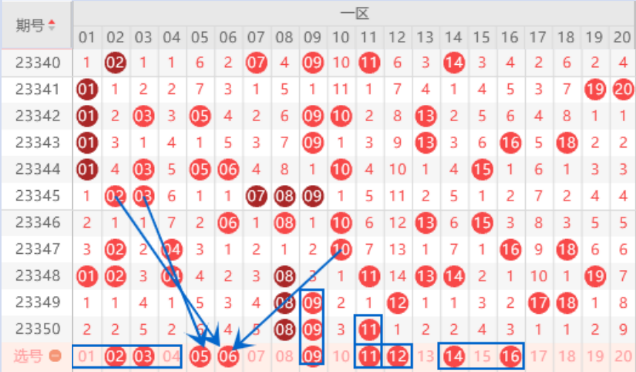 该区间的连号空一带号01 02 04已经两期没有回补了,本期我们注意一下回补的情况,重点考虑一下02 04号数字出号情况。本期的05号数字我们做一下防守,出号机会还是有的,可以防守一下05 06号数字同出的情况。上期开出了08 09 11号数字的连号空一带号情况,本期我们注意出重号的情况,重点关注一下09 11号数字走重的情况。本期的13 14号数字我们注意一下落下一个号吗的情况,重点关注一下14号数字的落号情况,防守一下14 16号数字同出的情况。
