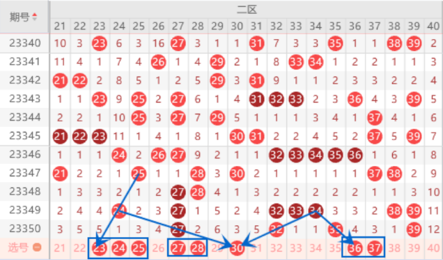 该区间的22 23号数字本期我们要注意落下号码的情况,本期的24号数字我们也是要注意一下的,这里可以防守一下三连号23 24 25号数字的出号情况。本期我们注意一下27号数字走4重号的情况,可以防守一下27 28号数字同出的情况。本期的30号数字是属于斜连号码,出号机会还是有的,我们需要注意一下。本期的36 40号数字都是斜连号码,我们要注意出一个号码的情况。