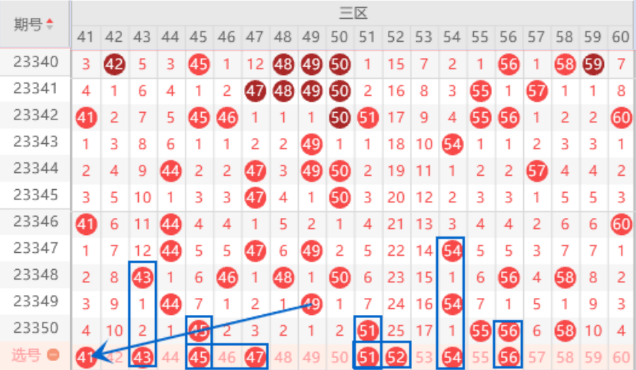 本期的41号数字我们注意一下,它是属于434走势,出号机会还是有的。本期的45号数字我们注意一下出重的情况,45号数字好久没有出重了,本期是有机会出重的。本期的47号数字我们注意一下出号情况。本期的48 49 50号数字我们做一下防守就行了,这里存在断号的风险。本期的52 53号数字我们要注意出一个号码的情况了,重点关注一下52号数字的出号情况就行了。上期开出了55 56 58号数字的连号空一带号,本期我们注意一下走重的情况,重点关注一下55 56出一个重号的情况就行了。