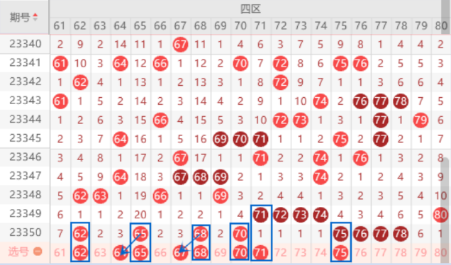 该区间上期开出了62 65 68号数字,本期我们注意一下出重号的情况,重点关注一下62 65出重的情况。该区间的61 64 67号数字属于1路号码,已经遗漏3期没有出号了,本期我们注意一下出号情况重点关注一下64 67号数字的出号情况。本期的70号数字我们注意一下走重的情况,4连号71 72 73 74号数字上期没能出重号,那么本期我们就要防守一下回补的情况了,重点关注一下71 74号数字的回补情况就行了。