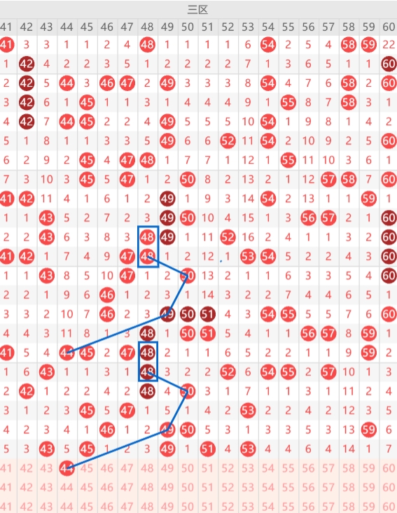 第二思路:近期相似走势,首先我们看上图蓝色线,48号重码下期落位50号隔期落位49号最后隔期落位44号球。
