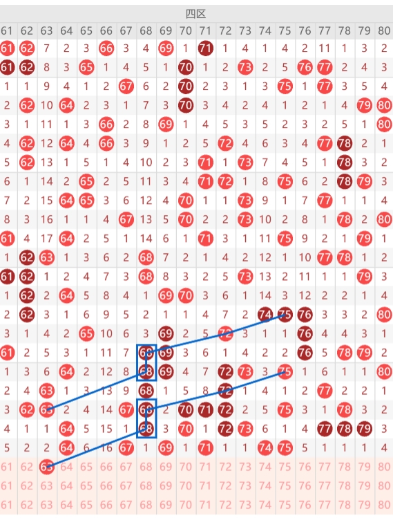 第二思路:近期相似走势,首先我们看上图蓝色线,75号下期落位72号再下期落位68重码隔期落位63号码球。