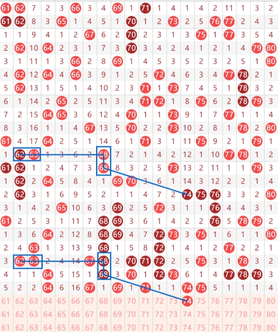 第二思路:近期相似走势,首先我们看上图蓝色线,62,63对子号码隔期落位68最后隔一期落位74号码球。