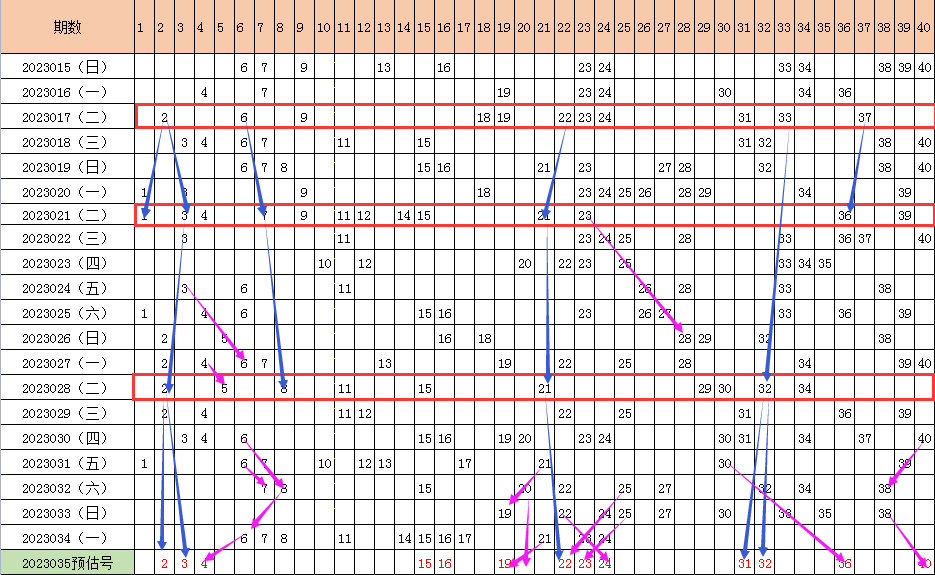 周期号码会开出落在号码22上面,02,32也有可能会根据前面一期落在本期开出相邻号,