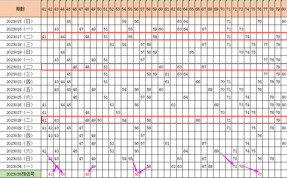 就可以预估41-44之间遗漏和没有重号的号码42,44会在本期开出,在来看看032期41斜开的