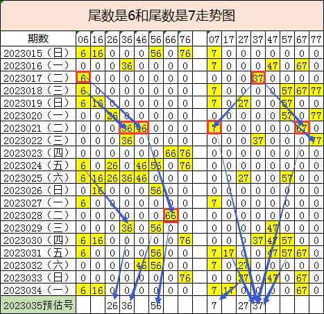 尾数6-7区间,尾数6同周期开奖号号码:06,36,46,66,没有开出重号,
