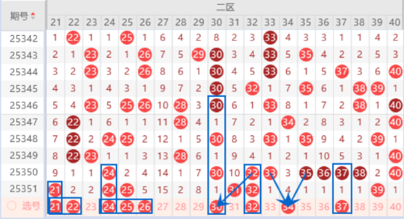 该区间22号数字是属于三斜连号码,出号机会是有的,我们可以关注一下出号情况。上期开出了24 25号数字的连号,本期我们注意一下出一个重号的情况,其中的24号数字可以重点关注一下。本期的30号数字是属于空一对称号码,本期出号机会也是有的,我们可以关注一下。本期的32号数字我们也是要注意一下出三重号码的情况。上期的四连号35 36 37 38号数字没能开出重号来,本期我们注意一下出一个号码的情况,其中的35 37号数字可以重点关注一下出号情况。