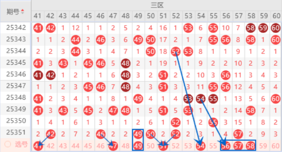 该区间41号数字是属于212走势,出号机会是有的,我们可以关注一下出号情况。上期开出了46号数字,本期我们注意一下走分边的情况,其中的47号数字可以重点关注一下。上期开出了46 49 50号数字,本期我们注意一下出一个重号的情况,其中的49 50号数字可以重点关注一下出一个号码的情况。本期的51号数字是属于阶梯号码,可以防守一下出号情况。本期的54 56号数字都是属于三斜连号码,本期可以防守一下出一个号码的情况。