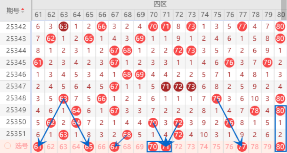 该区间的61号数字是属于三斜连号码,出号机会是有的,我们可以关注一下出号情况。本期的65 67号数字我们注意出一个号码的情况,其中的67号数字可以重点关注一下。本期的71号数字是属于空四对称号码,本期是有机会出号的,我们可以重点关注一下,本期可以防守一下67 71号数字同出的情况。本期的77号数字是属于三斜连号码,出号机会是有的,我们可以关注一下出号情况。
