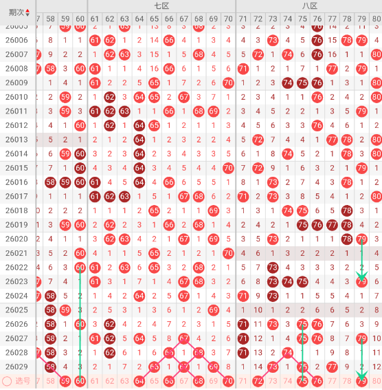 七区开出:65,67,69 奇偶比: 3:0 和值:201 跨度:4,上期开出3个号码,奇数号码占优势。这是另一个高热区间,近10期有7期开出3个或以上号码。上期开出65、67、69,又是全奇组合,且是连续的奇数跳跃。其奇偶失衡程度比二区、四区更甚,且持续时间更长。偶号回补的需求已如箭在弦上。考虑到上期~,本期该区~,加入~。本期推荐关注号码:64、68。