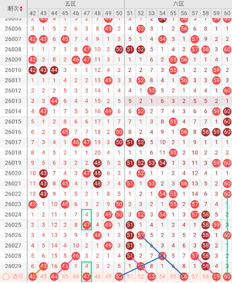 五区开出:43,45 奇偶比: 2:0 和值:88 跨度:2,上期开出2个号码,奇数号码占优势。该区是近期的深度冷区。已连续6期出号不超过2枚,处于严重被压抑状态。上期开出43、45,中间空出44,两边空出42和46。~,但在~,值得关注。本期推荐关注号码:44、47。