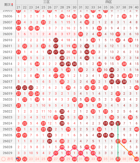 三区开出:27,29 奇偶比: 2:0 和值:56 跨度:2,上期开出个2号码,奇数号码占优势。该区表现相对稳定但不够突出,近10期平均每期开出2-3个号码。上期开出27、29两个号码,延续了该区单期出号不多但持续稳定的特点。该区的规律~,25-30这个子区间明显比21-24更活跃。本期可关注~,可能形成~组合。推荐关注号码:21、26、28。