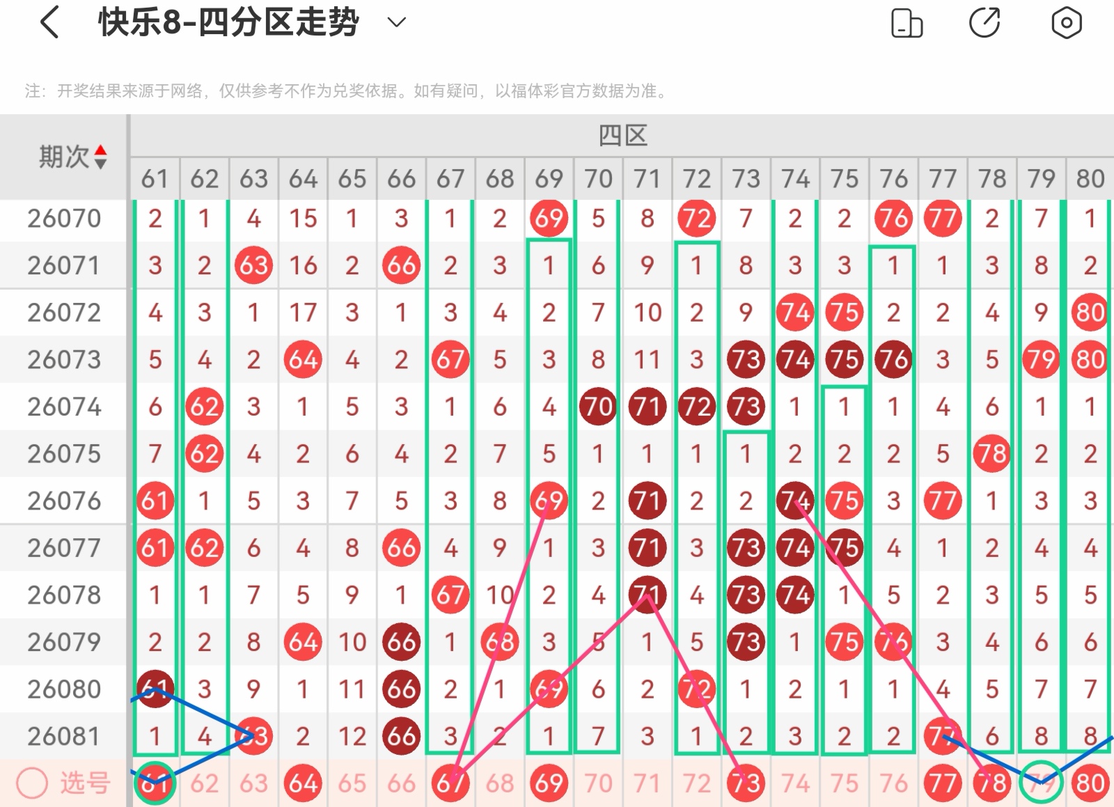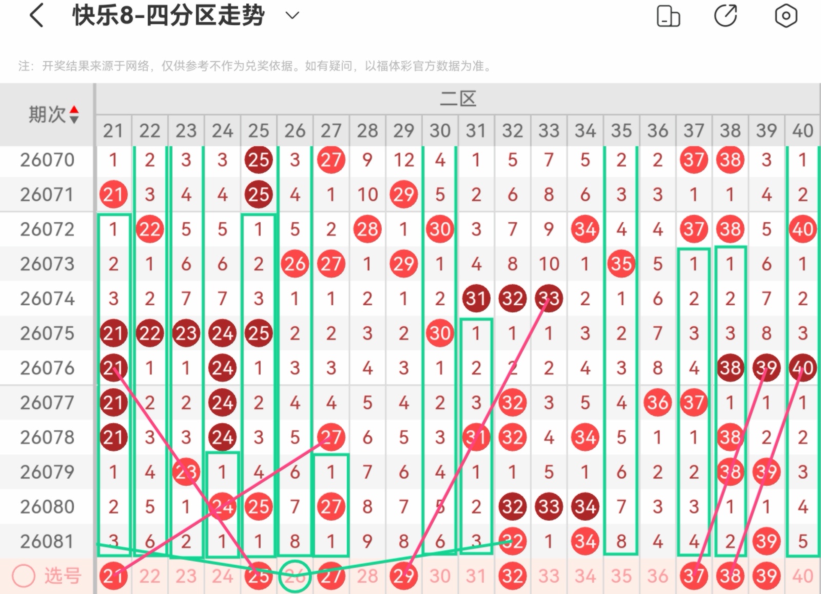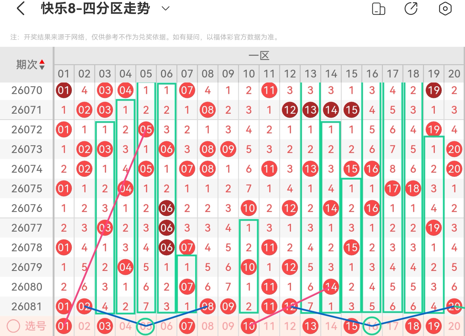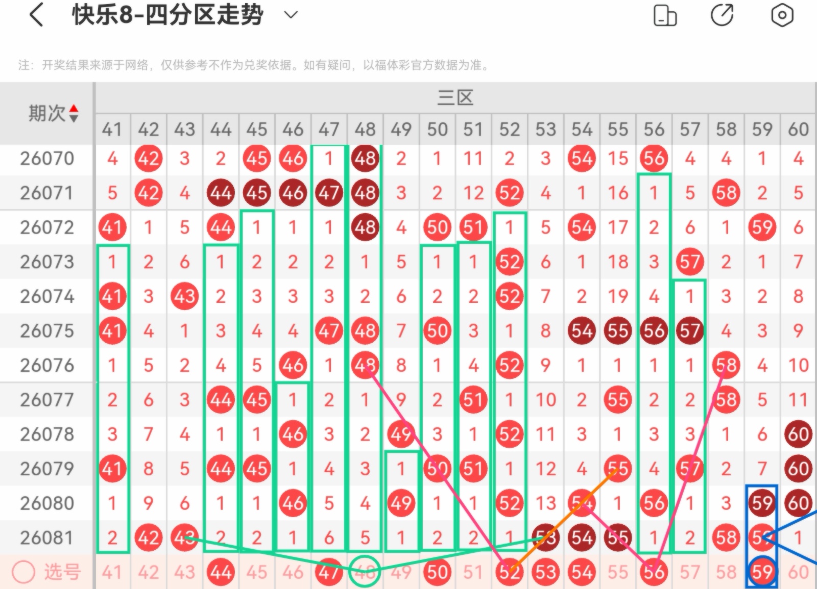 大家好,我是甜丝丝的坏事,主要以快乐八的形态走势、空位走势、遗漏走势以及斜连走势相结合的方法,用公认的四分区走势来进行预测分析,希望能让你有所收获。