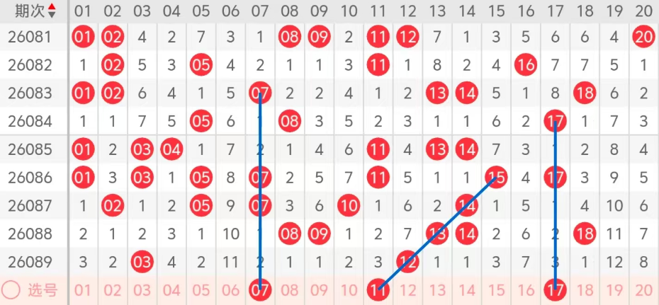 第一区间的走势分析:第一区间上期开出了两个号码球,主要的落号点位在一区间的前后半区,走出了一奇一偶的形态走势,上期一区间的前半区落下了一个号码球,后半区落下了一个号码球,整个一区间处于走冷的趋势,根据一区间的走势规律,今天的一区间我们主看前半区07的回补走出了对称的走势,再看11的斜连码落位,今天落下的机会很大,最后关注17的落位,注意07 17的组合,这三个号球建议大家打个三胆拖,或者打个三码复二比较稳妥,参考为主!