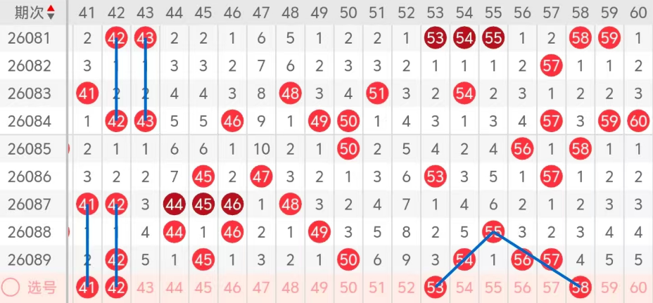 第三区间的走势分析:第三区间上期开出了六个号码球,主要的落号点位在三区间的前后半区,走出了两奇四偶的形态走势,上期三区间的前半区落下了三个号码球,后半区落下了三个号码球,整个三区间处于走热的趋势,根据三区间的走势规律,今天的三区间我们主看前半区龙头位置41 42姊妹对号码的落位,走出了和上面姊妹对一样的走势,再看后半区斜连码的走势53 58的落位,注意42 53的组合,这四个号球建议大家打个四胆拖,或者打个四码复三比较稳妥,参考为主!