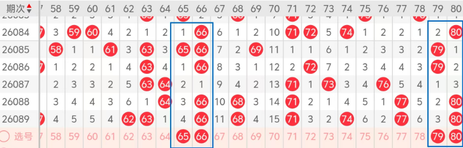 第四区间的走势分析:第四区间上期开出了八个号码球,主要的落号点位在四区间的前后半区,走出了三奇五偶的形态走势,上期四区间的前半区落下了四个号码球,后半区落下了四个号码球,整个四区间处于走热的趋势,根据四区间的走势规律,今天的四区间我们主看前半区65 66姊妹对号码的落位,录下一码的机会很大,再看后半区凤尾处79 80姊妹对组合的落位,这四个号球建议大家打个四码复三,或者打个四码复二比较稳妥,参考为主!