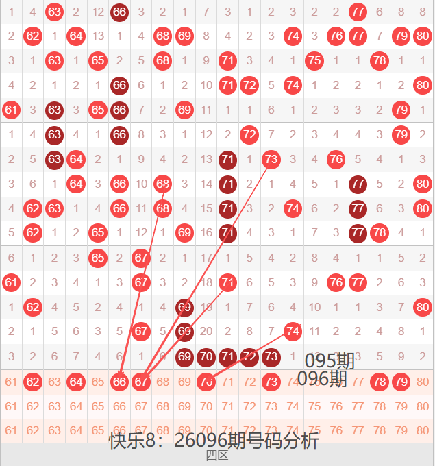 回顾26095期开奖号码:02 04 05 12 20 22 25 26 29 30 31 44 45 48 56 60 70 71 72 73  ,最近一段时间号码爆区几率特别高,目前已经连续多次出现爆区热开的情况,爆区之后基本上都是迅速回调,转换至其他区间继续暴热,大家若是能抓准区间,或许有很大的机会,但是号码的变盘规律是非常的快,很难把握,个人建议谨慎选择,不要 盲目的去操作~~