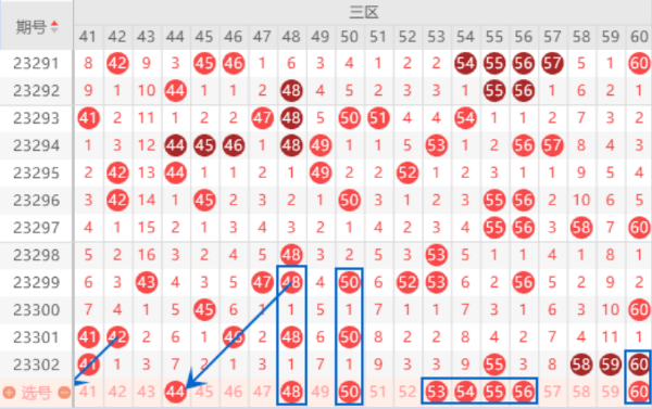 本期的44号数字是属于遗漏7期的号码,本期遗漏7期的号码也是有4个,出一个号码的情况是很大的,我们要重点注意了。本期的48 50号数字都是属于空一对称号码,本期是有机会落下一个号码的,我们要重点关注一下。连号52 53本期我们也是要注意落下一个号码的情况,重点关注一下53号数字。本期的55 56号数字我们要注意出现连号的情况。三连号58 59 60号数字有可能会出现重号,我们重点关注一下59 60号数字出重的情况就行了。