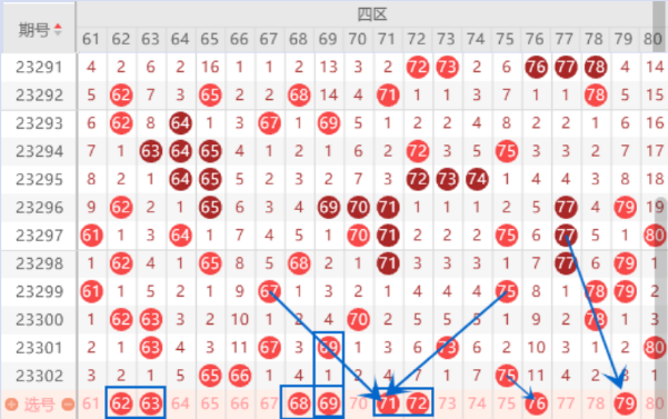 本期的63号数字我们关注一下,重号回补的情况还是有的。本期的68 69号数字我们要关注一下,尤其是68号数字出号机会是很大的,我们要注意一下。本期的71号数字是属于三斜连号码,出号机会是很大的,防守一下71 72或者71 73同出的情况。上期开出了75号数字,前两次开出的75号数字都没有分边,本期分边的机会是很大的,我们要注意74 76号数字出一个号码的情况,防守一下76 79同出的情况。