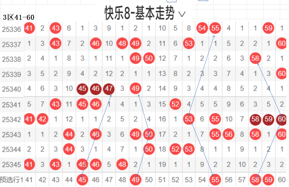 三区(41-60):遗漏5期以下有17码,0码41 43 45 46 48 5个,温开方式,这区码数有回暖之意,可以防一手,先定胆码走势较大者,隔期,斜三连,分边号码,可重防,间隔5期以上号码可以随走势选取,例如本期大冷码,走势比较大,可以做胆,通常联动可带出,分边对称的号码,本区间也有很大走势.可关注下.隐形夹角号码.做补位形态号码.都需要观察动态走势.以上是本区间的选码方法.