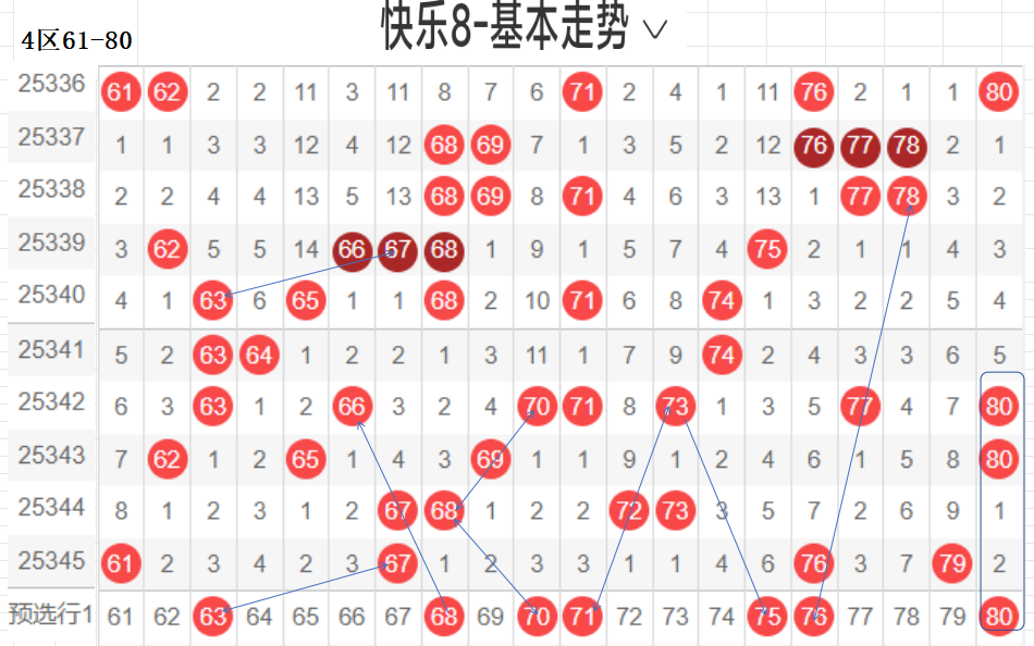 四区:(61-80):遗漏5期(含5)以下有18码,0码61 67 76 79 4个,平均温开方式,上期开出4码,区间回暖,后区可防,四区间从以往数据来看,重码很强,一枝独秀的存在,近期有回补走热的趋势,区间回暖后,本区间后区可防,与一区相比,也是温区.,对称下落码,隔期回补码,可以防守,这区对呈对称三角关系的胆码,斜三连有走势的胆码,联动落位码,都有各自的走向落位关系,根据走势选择一种方式选码.