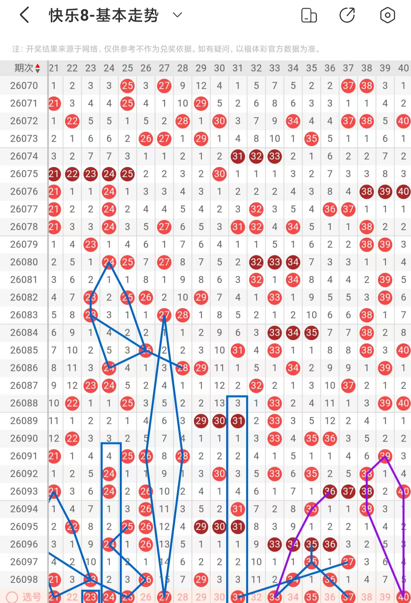 二区间大面积增加落号,一共开出六个号码球,本期考虑减少号码球的数量,注意近期23、24、25、26号码球的走势与20、21、22、23号码球的走势相似,本期注意21号码球,阶梯落位重码走势注意23号码球,注意期数和值加减法的24号码球,注意百期相似形态的25号码球,防守菱形形态的27号码球,注意隔期对称回补的31号码球,以30号码球为对称走势起点,注意走势形态的33号码球,同时也是两重码带三斜连走势回补号码球,也是0、1、2期走势号码球,防守35号码球,注意斜连走势回补的37号码球,同时也是隔期递减号码球以及期数和值加减法号码球,注意近期38、39、40号码球的走势相似,本期注意40号码球,因此二区间关注21-25-33-37-40,注意本区间的选二复式21-33-40。