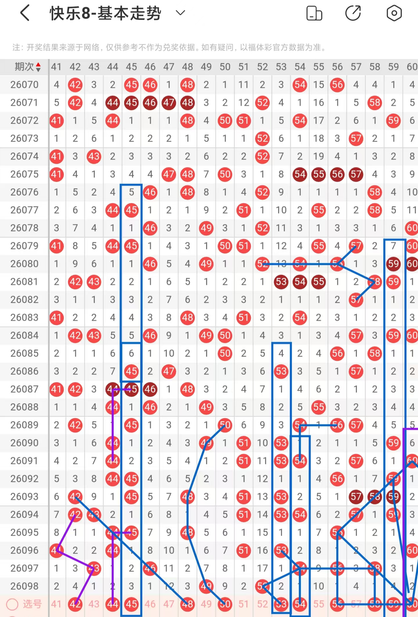 三区间上期大面积减少落号,一共开出两个号码球,本期考虑增加号码球的数量,注意期数和值加减法的42号码球,同时也是百期相似形态号码球,注意近期44、45号码球的走势相似,本期注意44号码球,注意期数和值加减法的45号码球,注意斜连走势回补的48号码球,注意斜连走势回补的50号码球,注意期数和值加减法的53、59号码球,同时53号码球也是百期相似形态号码球,近期53、54、56、58号码球的走势与52、54、56、57号码球的走势相似,本期注意53号码球,注意隔期对称回补的54号码球,近期54、56号码球同期下落,下期回补54号码球,直角三角形走势注意56、60号码球,近期56、57、58号码球的走势与63、64、65号码球的走势相似,本期注意56号码球,注意隔期递减的60号码球,因此三区间关注42-45-53-56-59,注意本区间的选二复式42-53-59。