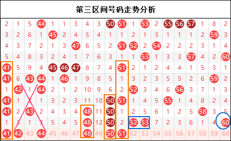 第四区间思路:四区基本也是半死不活的走法,连号之后走的是不温不火。昨天前半部分同形态的连码下拉全部放空,仅以一码的邻号出现,且同时将近距离形态参照的走势打的七零八落。唯独后半部分的重号这里做了分边走势,甚至三重号在这个区间也没有占据到优势。那今天四区看起来又是一次相当大的挑战,既没有走势可研究,也没有形态可参照。不过从整个图中我们看到补充空白区域是当前四区最大的主线,所以本期四区要么做空白区域独码,要么做上一期号码邻号。