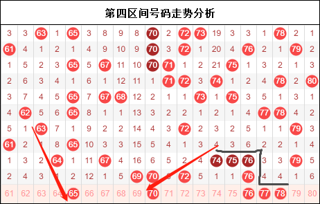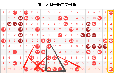 第三区间昨天顺着47 48两哥号码下来之后,这里再一次走势变得扑簌迷离。而随着号码52的出现,三区分块现象在这一期有很大可能出现一个分开的走势终结,尤其是我看好的三角杀在近期出现的尤其频繁,但是没有一次能够完美的呈现出来,本期希望这里能给出一个玩的走势来完成我的梦想。而后半部分随着57的重号出现,这里应该是将要告一段落,走势上开始出现整体的转移,这一点需要注意了。