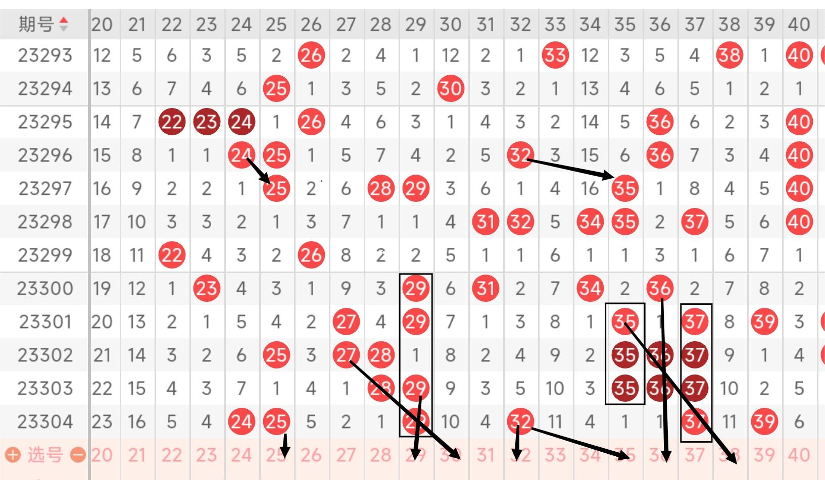 区间分析:二区在23298期开出了6个号码球和23302期开出六个号码球和上期也开出了6个号码球,二区的近期出码情况是比较热门的,近期的号码球37号更是4连出的走势和号码球35号球有这着3连出的走势,可以继续关注号码球37号球的五连出和注意号码球35号球和号码球36号球的开出,斜开奖趋势号码球注意29号球的三连出和号码球30号球的开出