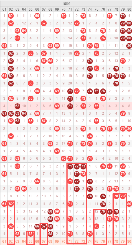 四区:最近四区10期出号情况为:7 4 4 6 4 5 5 5 5 5,总出号情况为50个,平均出号5个,本期四区号码推荐:62 65 67 71 72 73 75 76 78 79。重点关注:62 65 67 72 73 76。