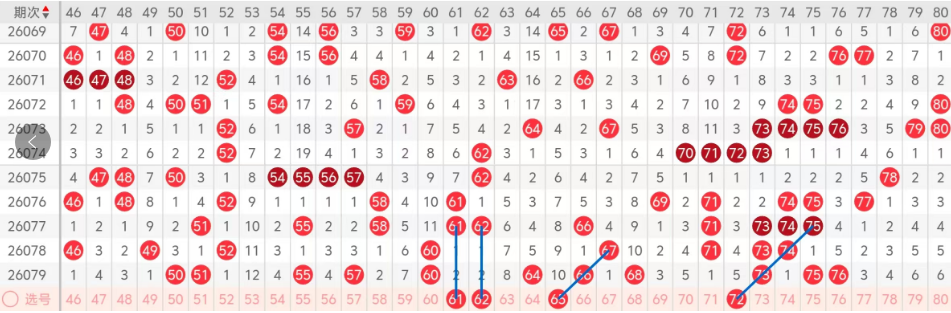 第四区间的走势分析:第四区间上期开出了六个号码球,主要的落号点位在四区间的前后半区,走出了两奇四偶的形态走势,上期四区间的前半区落下了三个号码球,后半区落下了三个号码球,整个四区间处于走热的趋势,根据四区间的走势规律,今天的四区间我们主看61 62姊妹对号码的回补,落下的机会很大,再看夹码加斜连码走势65这个号码球的落位,最后关注72这个号码球的落位,这四个号球建议大家打个四码复三,或者打个四码复二比较稳妥,参考为主!