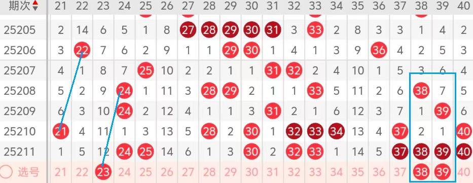 第二区间的走势分析:第二区间上期开出了九个号码球,主要的落号点位在二区间的中间和凤尾,走出了四奇五偶的形态,二区间最近两期开始突然走热,今天我们认为热度应该有所降低,落号开始转向,今天的龙头主看23的落位,这里正好走出了一个对称的形态,也是热码24 23交替开出的规律!再看后半区夹码38 39的落位,今天这里至少有一码开出,大家参考为主!