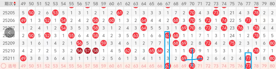第四区间的走势分析:第四区间上期开出了四个号码球,主要的落号地位在四区间的中间和后半区,走出了三奇一偶的形态,四区间今天的号码应该有所增加!今天的龙主看67的落位,在这里走出了对称的形态!再看夹码70这个梅花号,今天有很大机会落下,最后关注后半区77的重码,从80开始到79 78 都走出了重码,今天的77走重的机会还是很大的!大家参考!