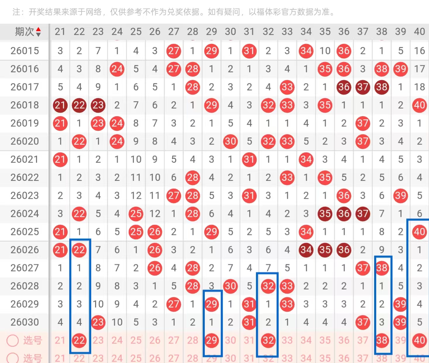 二区21-40:二区间,上一期回补了4个号码的下落,从近期二区间号码下落点位来看,呈现出了由热转冷的形态,今天我们要重点关注的是二区间空缺位置的下落和对子下面的回补,在二头首先我们要重点关注的是21-22的下落点位和29-30的下落点位,今天这里可用22-29和21-30的搭配回补,回到三头位置,今天这里我们要重点关注的是32-33的下落点位和38-40的下落点位,今天这里可关注32-38和33-40的搭配,回到在中部位置,值得我们重点关注的是开出对子和三连的可能。