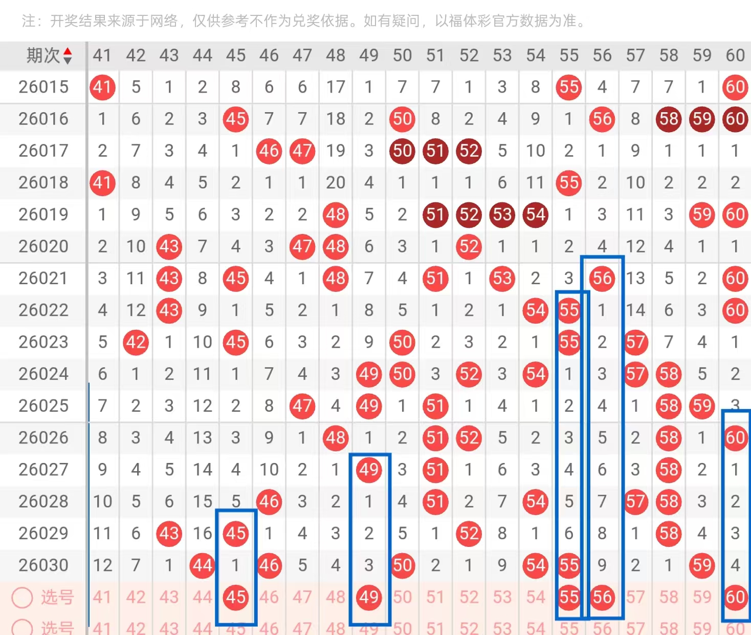 三区41-60:三区间,上一期回补了6个号码的下落,从近期三区间号码下落点位来看,呈现出了由冷转热的形态,今天我们要重点关注的是三区间空缺位置的下落和对子下面的回补,在4头,首先我们要重点关注的是梅花形态号码的一个下落点位,今天这里可重点关注43-47的下落点位和49-51的下落点位,今天这里可用43-49和47-51的搭配回补,回到五头位置,今天这里我们要重点关注的是50-55的重码下落点位,和59-60的下落点位。今天这里可用55-60和50-59的搭配回补。