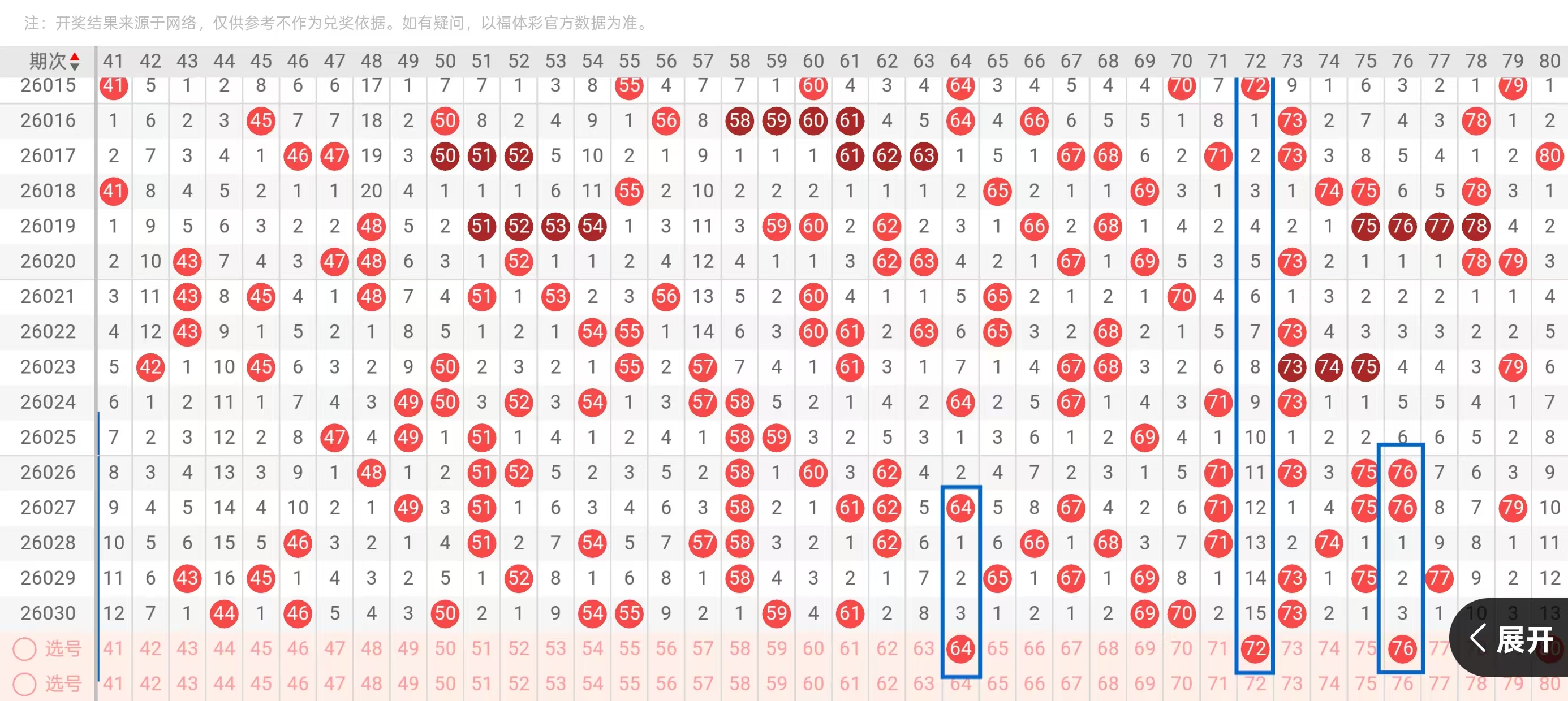 四区61-80:四区间,上一期回补了4个号码的下落,从近期四区间号码下落点位来看,呈现出了由热转冷的形态,今天我们要重点关注的是四区间空缺位置的下落和对子下面的回补,在6头,首先我们要重点关注的是62-64的下落点位和68-70的下落点位,今天这里可用62-68和64-70的搭配回补,回到7的位置,今天这里我们要重点关注的是72-80的下落点位和中部位置76-77的下落点位,今天这里可用72-76和77-80的搭配回补,这里值得我们重点关注的是开出对子的可能。