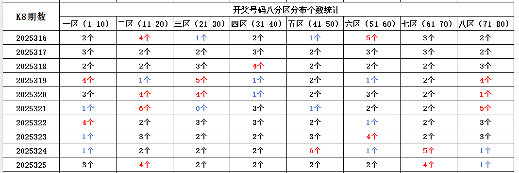 如图,红色字体是热号区,区间开出4个及以上号码。蓝色字体是冷号区,区间开出1个及以下号码。以近10期为一个分析周期,依据久热必冷,久冷必热的规律,本期重点关注:二区、七区,区间可能开出3-4个号码。八区,区间可能开出1-2个号码。个人分析,仅供参考。
