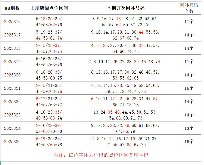 如图,上期的遗漏号码在下期开出10个左右,即为回补号码。定准点位区间首尾号码是关键!以上期2025325期为例,定位4个遗漏区间,围中16码!结合上期开奖号码,以跨度值大于或等于7为依据,本期关注3个遗漏区间:26-34/47-55/67-75;重点关注遗漏区间:4-18/25-38/42-56/64-76区间遗漏号码可能在本期回补开出。注意区分遗漏区间回补号码和大底号码,不要混淆。个人分析,仅供参考。