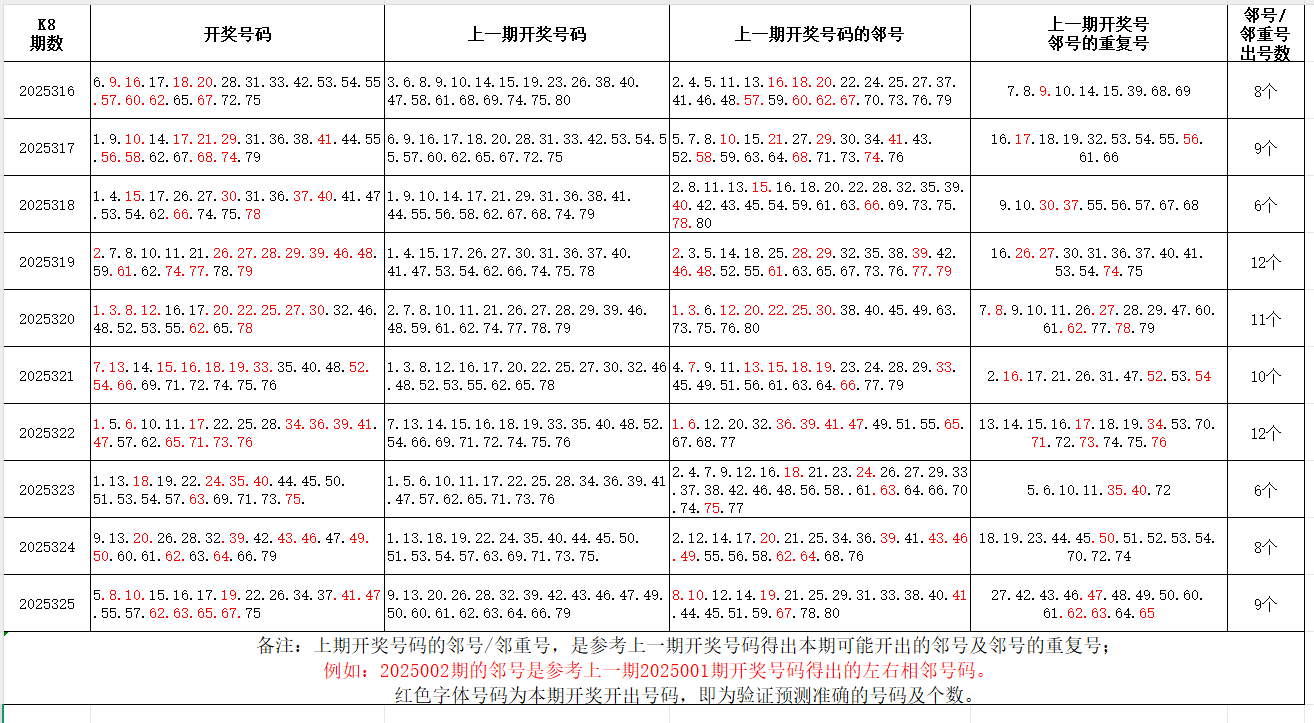 如图,红色字体是上期邻号、邻重号在下期开出,每期开出10个左右。上期邻号开出5个,邻重号开出4个本期参考邻号:4.6.7.11.14.20.21.23.25.27.33.35.36.38.40.42.46.48.54.58.61.68.74.76邻重号:9.15.16.17.18.56.62.63.64.66个人分析,仅供参考。