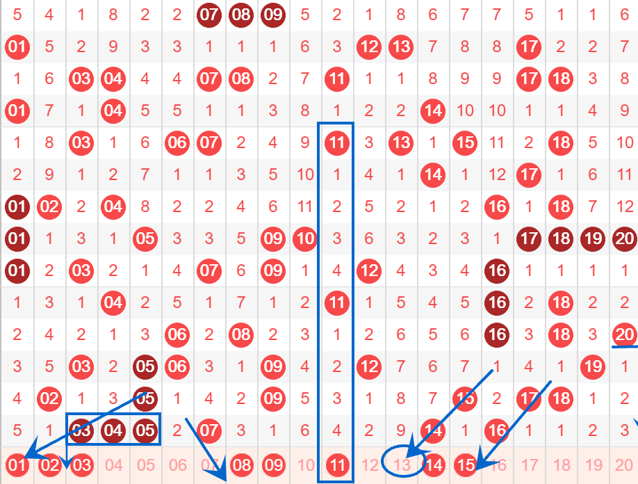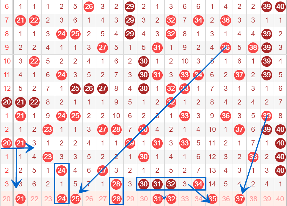 连号20 21已经遗漏3期了,本期我们要注意一下落号情况。25号数字的连线有点长,但是我们还是要重点关注的。三连号30 31 32我们也是要注意落重号的,重点关注一下31 32落重号。上期的2个遗漏10期以上的号码没有开出来,所以本期的35 72本期我们要关注一下。