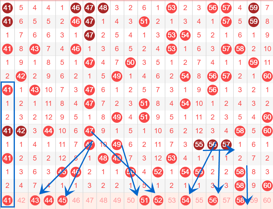 该区间的41号数字属于212走势,可以防守一下。上期的连号45 46没能落下重号来,那么本期我们就要注意直落的情况了。上期的连号空一带号52 54 55没能落号下来,那么本期我们就可以在这里定一个胆码出来了。本期连号空一带号58 60 61我们也是要注意落重号的,建议关注一下58号数字。