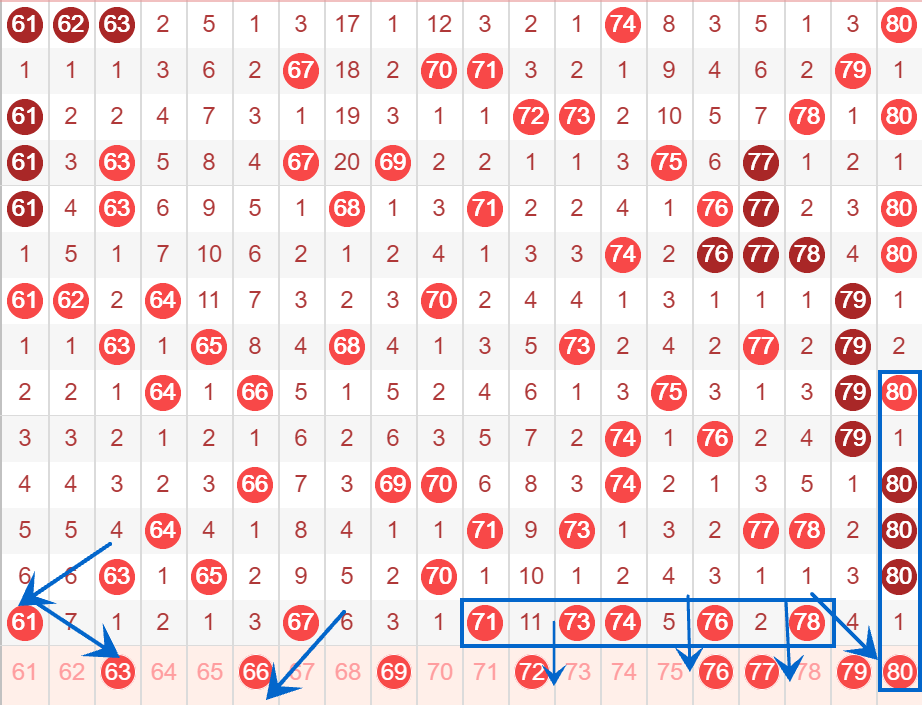 该区间上期0路号码断号了,那么本期的63 66 69 70是要出号了,要防守一下大爆发的情况了。上期来出了71 73 74 76 78的连号空一带号,那么夹号和重号就要重点关注了,重号重点关注71 76号,夹号可以关注72 77的出号情况。其次就是我们要注意本期的79 80号连出的情况。