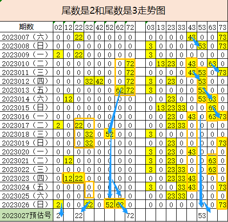 尾数2-3区间:尾数2近20期周期开奖号码3次,两期空挡,