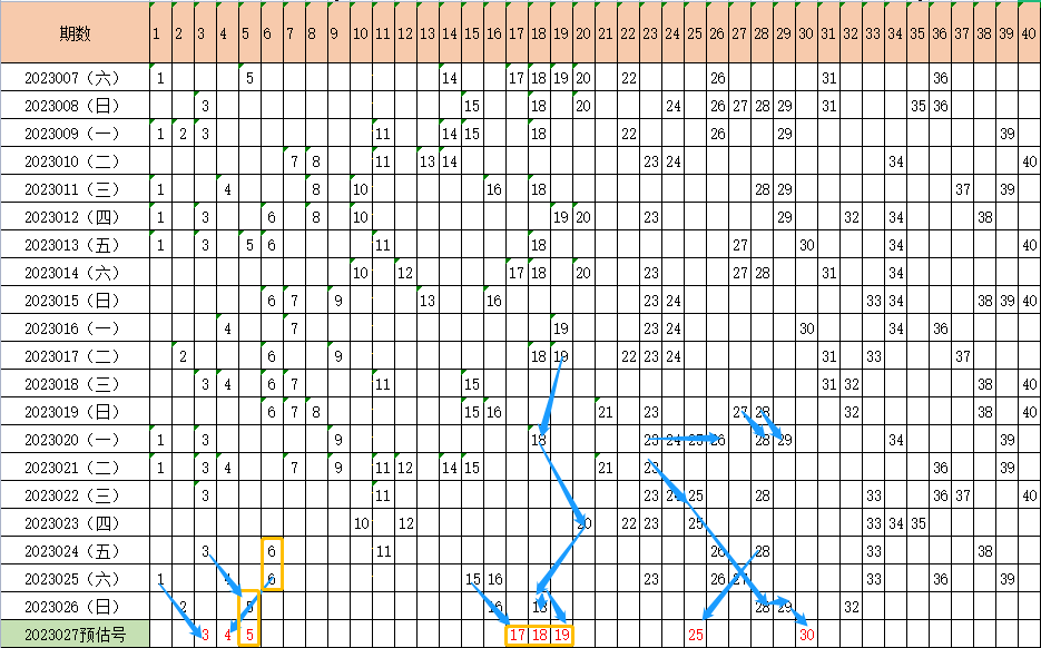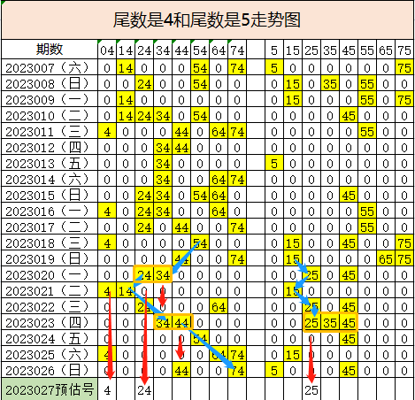尾数5没有明显走势,有一个特色走势在2023期,25,35,45