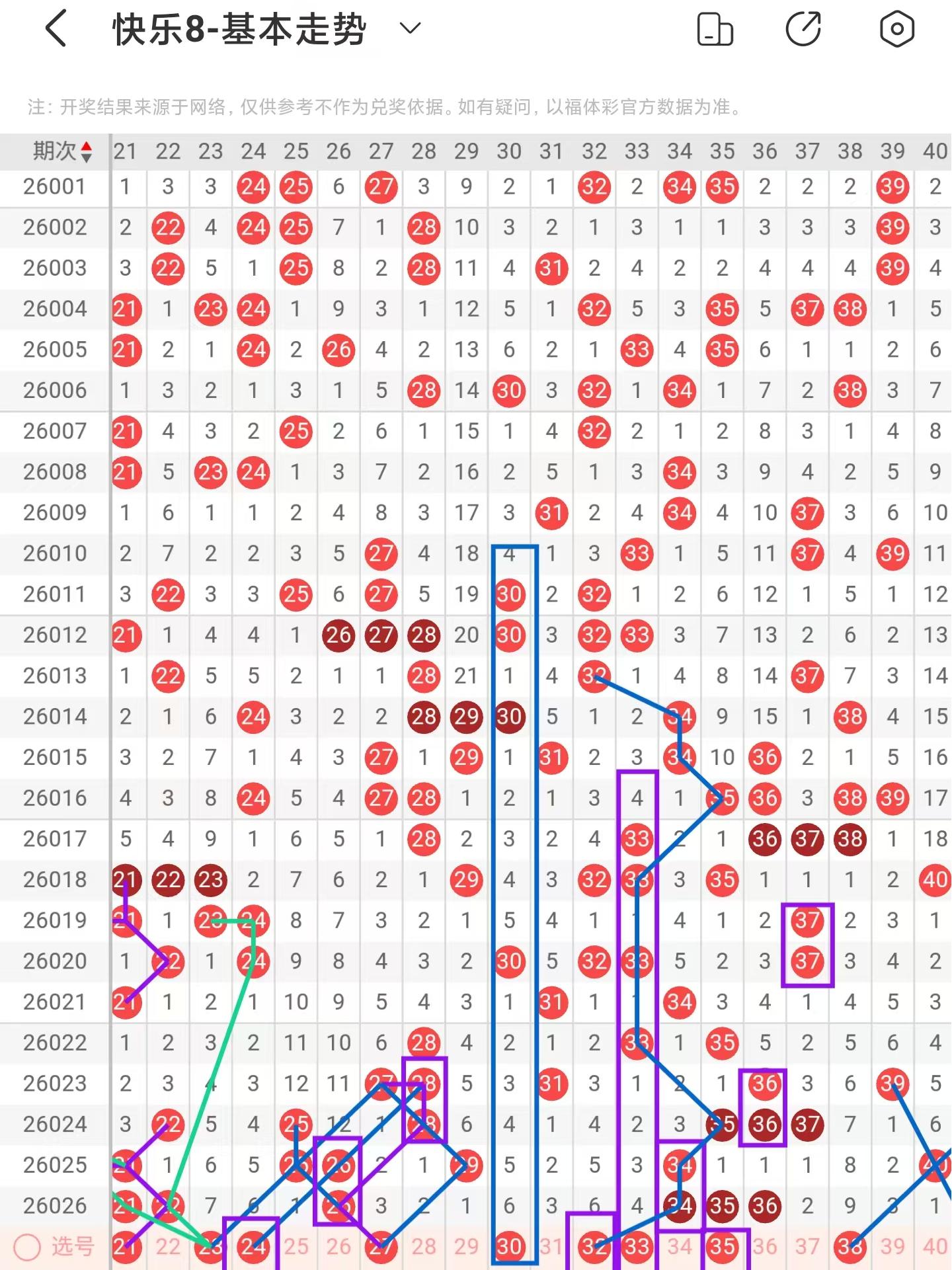 二区间稳定落号,一共开出六个号码球,本期考虑减少号码球的数量,注意近期20、21、22号码球的走势形态,本期注意21号码球,注意斜连走势构成平行四边形形态的23号码球,同时也是百期相似形态号码球,阶梯落位重码走势注意24、32、35号码球,注意直连转斜连走势的24号码球,阶梯落位连码走势注意22、23、24号码球,注意斜连走势构成平行四边形形态的27号码球,同时也是百期相似形态以及两重码带三斜连走势号码球,注意期数和值加减法的30号码球,注意隔期对称回补的33号码球,防守斜连走势回补的38号码球,因此二区间关注21-23-27-30-32。注意本区间的选二复式24-27-30。