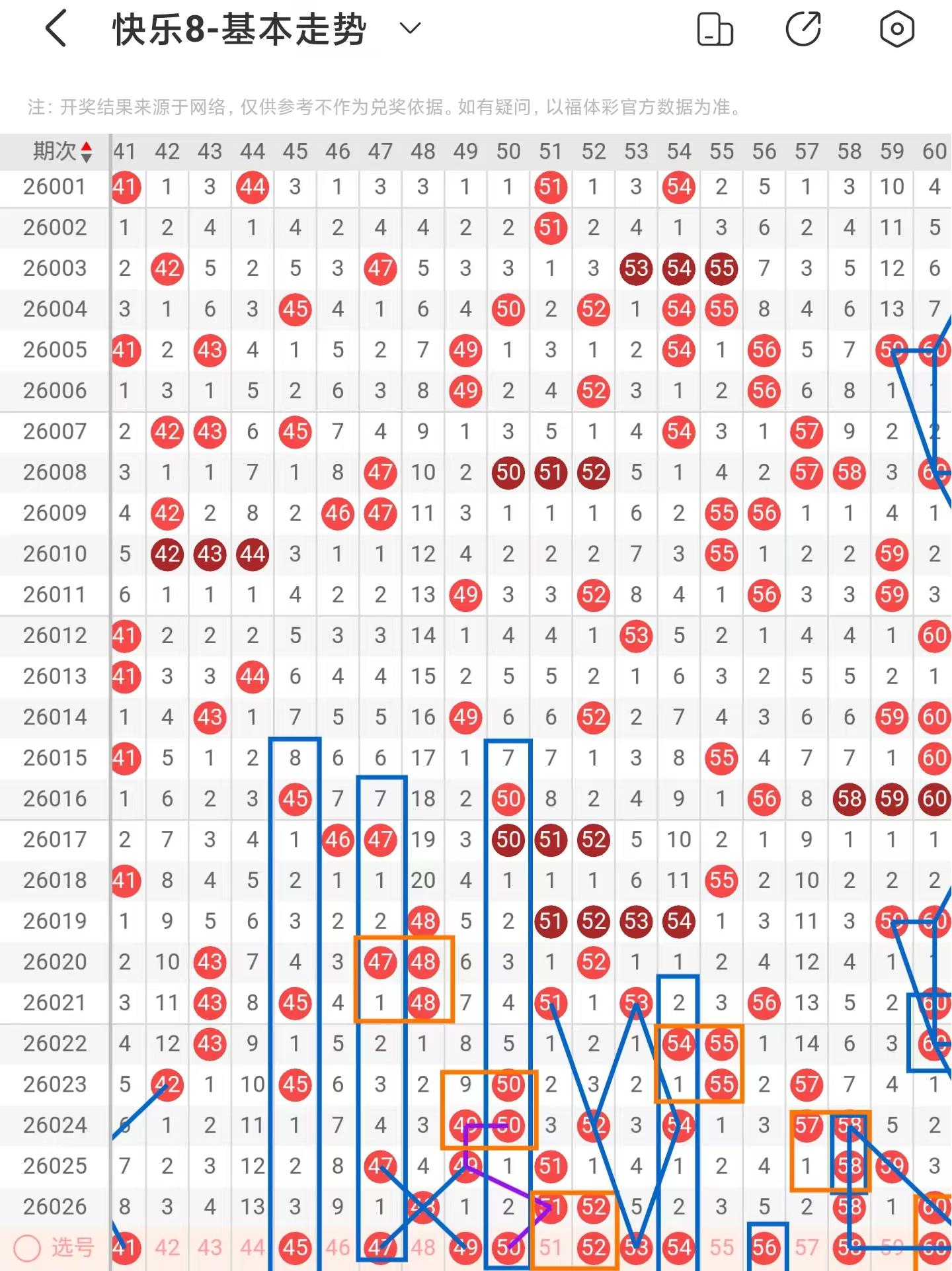 三区间上期稳定落号,一共开出五个号码球,本期考虑增加号码球的数量,注意斜连走势回补的41号码球,注意期数和值加减法的45、47、50、53号码球,以48号码球为交叉中心点,注意分边落号的47、49号码球,阶梯落位重码走势注意52、56、60号码球,防守菱形形态的53号码球,两码同期下落,下期回补一码的走势注意52、60号码球,注意防守49号码球以及隔期对称回补的54号码球,因此三区间关注49-50-52-54-60,注意本区间的选二复式52-54-60。