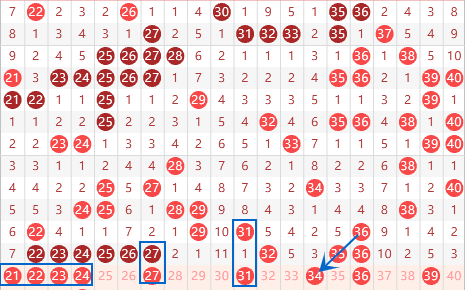 上期开出了6连号22 23 24 25 26 27号数字,本期我们就要注意21 22 23 24出连号的情况,可以防守一下。本期的27 32我们也是要注意走重的情况,这里出一个应该是没有问题的。本期的31号数字是属于181走势,我们可以防守一下它的出号情况。上期开出了35 36连号,本期我们要注意一下这里出现三角的情况,还是有机会的。