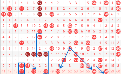 上期开出了44 45,本期我们要注意出重号的情况,重点考虑一下44号数字的出号情况。连号46 47 48本期我们也是要注意落下来的。本期的冷号我们关注一下50号数字就可以了,其他号码的出号机会不是很大。上期开出了连号空一带号54 55 57,本期我们要注意一下夹号56号数字的出号情况,如果56号数字不出,那么我们就要注意54 55 57出重的情况了。