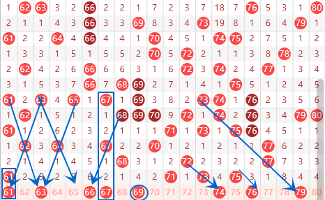 该区间的61 63 65我们要注意出号情况,尤其是61 63号数字的出号情况是很大的,可以重点考虑一下。本期的62是属于212走势,68号数字是属于121走势,我们可以关注一下出一个号码的情况。本期的69号数字我们可以防守一下,本期还是有出号机会的。上期开出了71 73 75,那么本期我们就要注意走重的情况和出夹号的情况了。重号关注一下71,夹号关注一下74号数字。